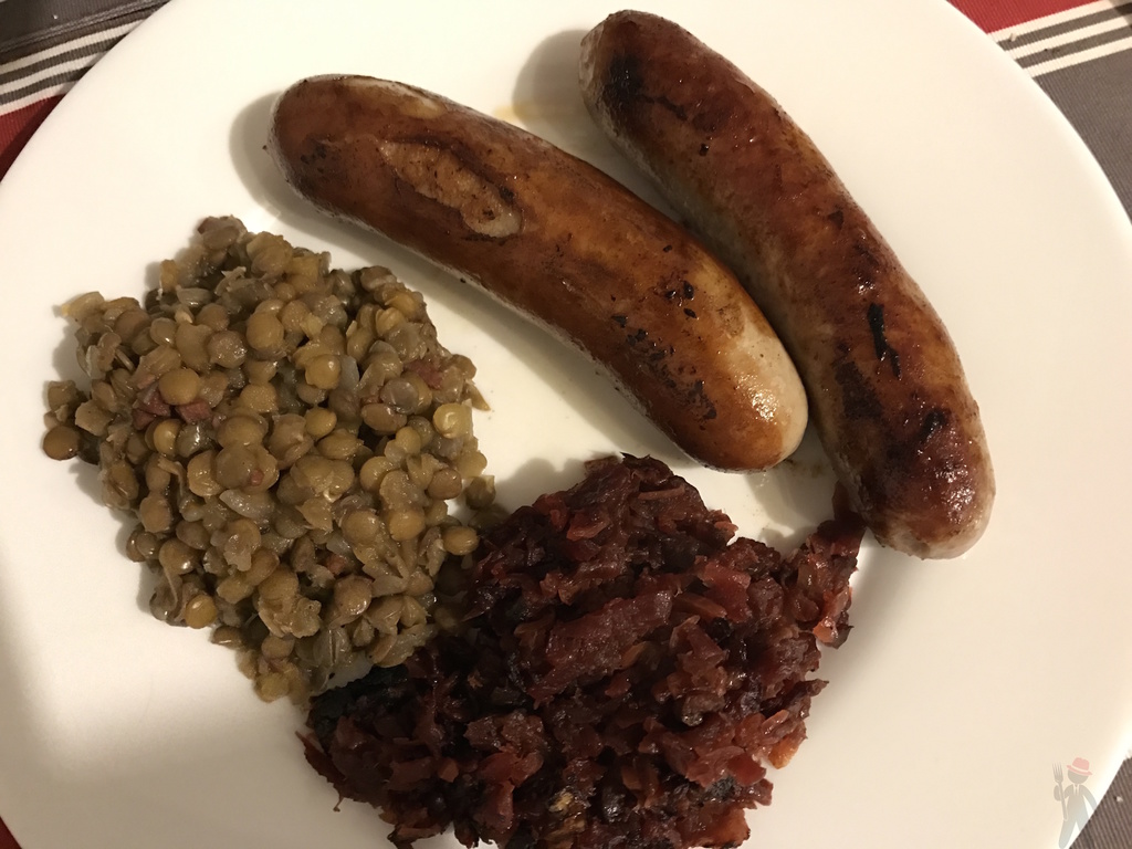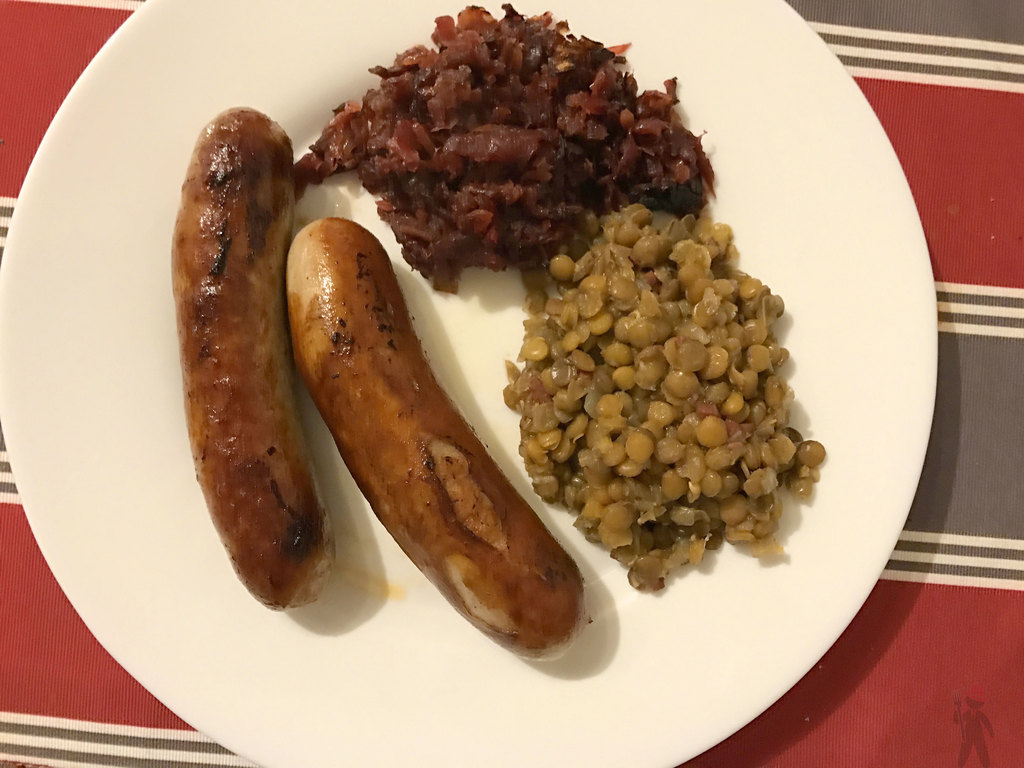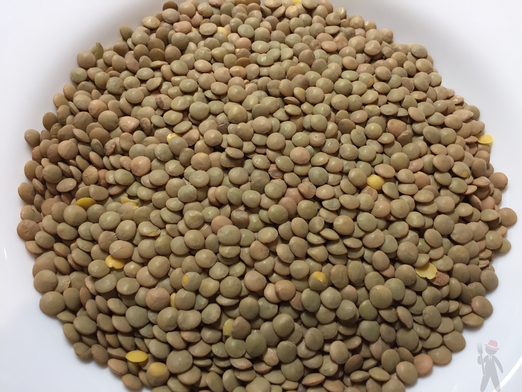 Die Zwiebel schälen und fein hacken. In einem kleinen Topf das Butterschmalz erhitzen und dann die Hälfte der Zwiebel und den Schinken darin anbraten. Wenn die Zwiebel etwas Farbe bekommen hat, mit Weißwein ablöschen. Die Linsen dazugeben und dann die Brühe dazugießen. Das Lorbeerblatt, die Nelken sowie etwas Salz und Pfeffer dazugeben. Dann aufkochen und danach die Hitze auf die niedrigste Stufe reduzieren und die Linsen für 40 Minuten köcheln lassen.