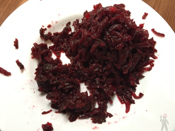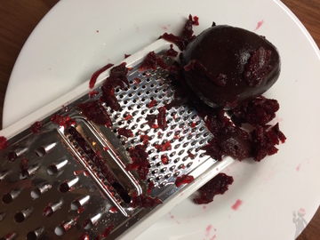 - Zum Raspeln der roten Beete können Einmal-Handschuhe praktisch sein, wenn man lieber keine roten Hände hat.