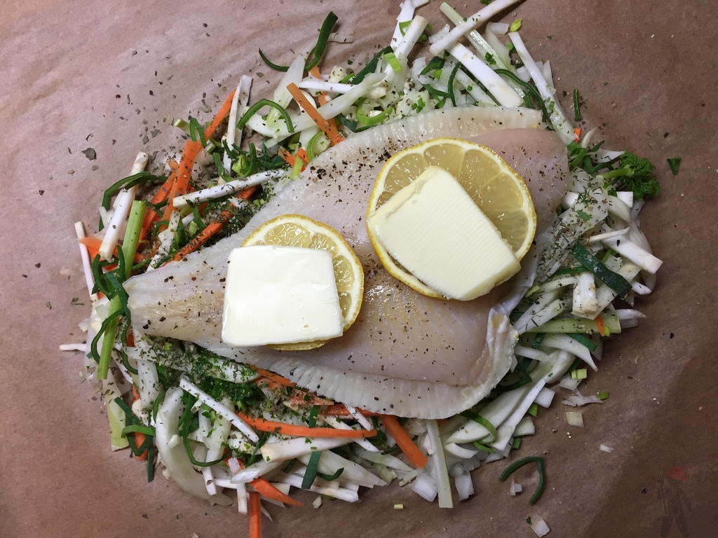 Je die Hälfte der vorbereiteten Zutaten mittig auf einem Stück Backpapier (entweder ein Zuschnitt oder ein Stück von der Größe eines Blechs) verteilen. Etwas Salz und Pfeffer hinzufügen und ggf getrocknete Kräuter (Dill, Petersilie). Dann je ein Fischfilet darauf legen und auch diese mit Salz und Pfeffer würzen. Auf jedes Filet etwa zwei Zitronenscheiben legen sowie einen TL Butter.
