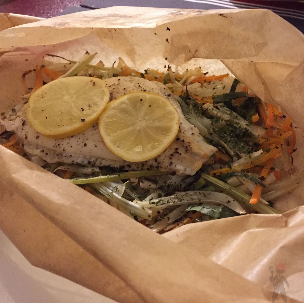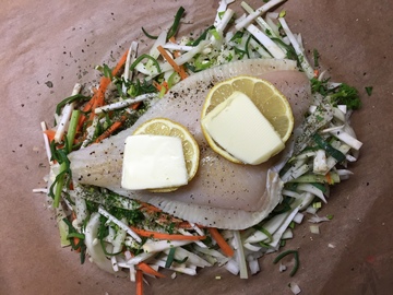 Fisch auf Gemüsestreifen im Backpapier