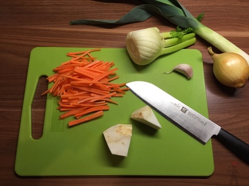 - Das Schneiden des Gemüses dauert relativ lange. Wenn es schneller gehen soll, nur so viele Gemüsestreifen schneiden, dass der Fisch bequem liegt und den Rest in größeren Stücken z.B. im Kochtopf zubereiten.
