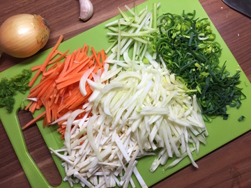 Karotten und Sellerie schälen. Vom Fenchel schlechte Stellen sowie das Grün entfernen; das Grün beiseite legen. Das Gemüse bis auf den Lauch dann in feine, etwa 6cm lange Streifen schneiden. Den Lauch putzen, die Enden abschneiden und eventuell die äußerste Schicht entfernen. Dann in feine Ringe schneiden.