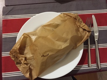 Nun pro Päckchen wie folgt falten: Die langen Seiten zur Mitte falten. Dann an den kurzen Seiten das Papier mehrfach umschlagen und entweder mit einer Tackernadel oder etwas Faden befestigen. Die beiden Päckchen auf ein Blech legen und im vorgeheizten Backofen für 20 Minuten bei 180° backen.