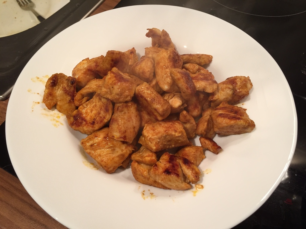 Die Hähnchenwürfel in einer Schüssel gut mit Paprikapulver, Kurkuma, Cayennepfeffer und etwas Salz würzen. Sie sollten wie leicht paniert aussehen. Dann in einer großen Pfanne das Öl erhitzen und wenn es recht heiß ist, die Hähnchenstücke darin von allen Seiten anbraten, so dass sie braun werden. Dann zunächst wieder herausnehmen und abgedeckt beiseite stellen. In der heißen Pfanne die Zwiebel und den Knoblauch kurz anrösten, dann mit etwa 300ml Wasser ablöschen.