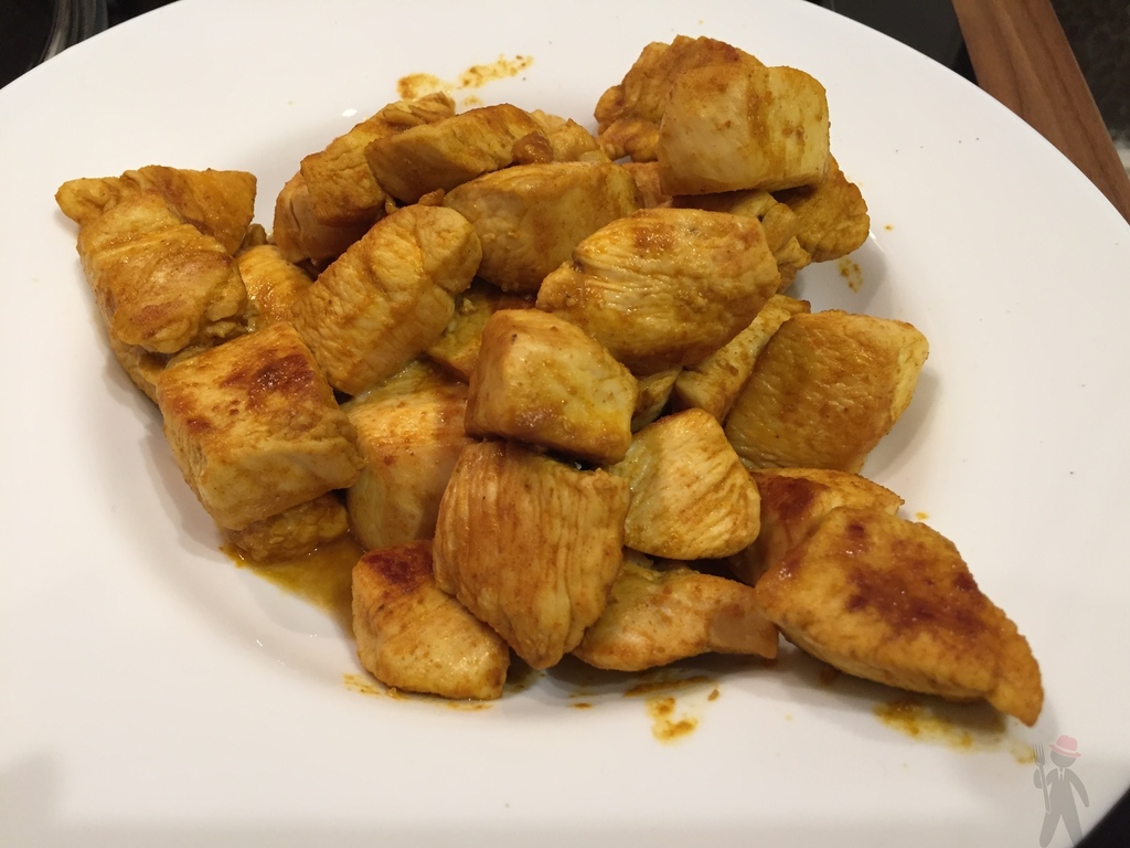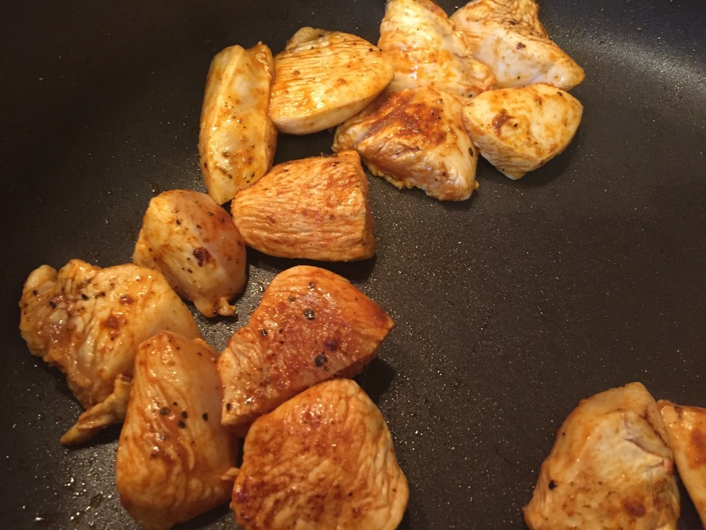 In einer großen Pfanne das Rapsöl heiß werden lassen und dann die Hähnchenwürfel darin anbraten. Etwas Pfeffer und Paprikapulver über das Hähnchen verteilen und diese häufig wenden, bis sie von allen Seiten leicht gebräunt sind. Dann die Hähnchenwürfel aus der Pfanne nehmen und in einem Teller beiseite stellen.