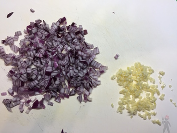 Je nach dem wie viel Fett noch in der Pfanne ist, etwas Olivenöl dazugeben und die Hitze reduzieren. Dann den Knoblauch und die gehackten Zwiebeln in der Pfanne etwas anschwitzen. Wenn die Zwiebeln leicht gebräunt sind, die Tomaten aus der Büchse dazugeben. Diese mit einem Pfannenwender oder Kochlöffel etwas zerteilen, so dass sie besser zerkochen können. Salz, Pfeffer, Paprikapulver, Kreuzkümmel und etwas Kurkuma dazugeben und unterrühren.