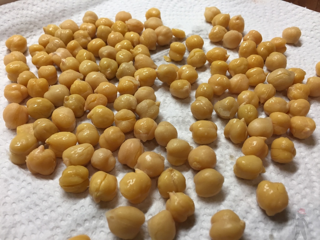 Die Kichererbsen aus der Büchse in ein Sieb gießen und waschen. Dann jeweils eine Handvoll zwische den Handflächen rubbeln um die Schalen zu lösen. Dies ist nicht unbedingt notwendig, sondern eher Geschmackssache. Die Kichererbense entweder im Sieb trocknen lassen oder, wenn es schnell gehen soll, mit Küchenpapier trocknen.
