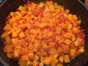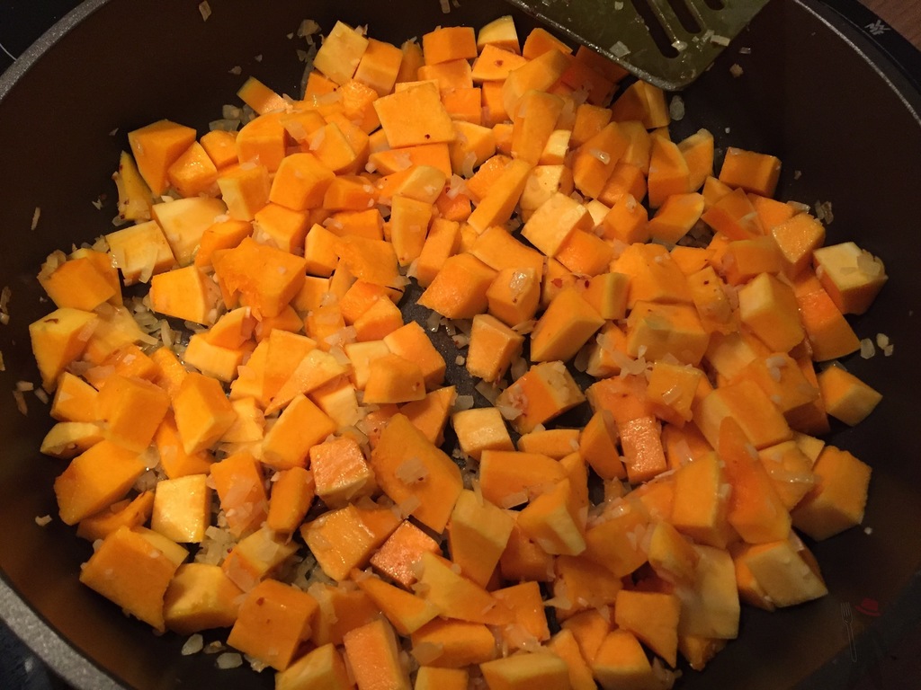 Je nach dem wie viel Öl in der Pfanne verblieben ist eventuell noch etwas dazugeben und darin die Zwiebeln, den Knoblauch mit Chiliflocken andünsten. Nach einer Weile die Kürbiswürfel dazugeben und diese auf niedriger Hitze für einige Minuten mitdünsten. Dann die Paprikawürfel hinzufügen und auch diese zunächst dünsten.
