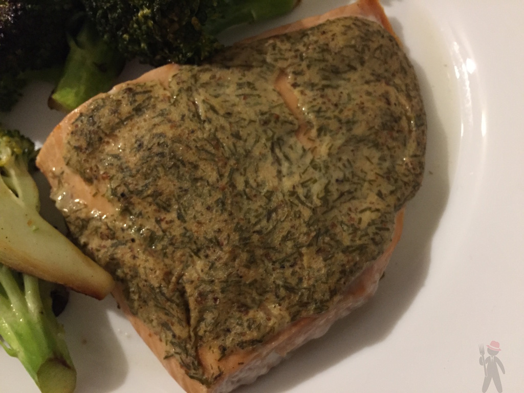 Die Lachsfilets abwaschen und etwas mit Küchenpapier trocken tupfen. In einer Schüssel den Senf mit etwas Zitronensaft, Dill, Salz und Pfeffer gut vermischen. Den Brokkoli putzen und in Röschen zerteilen, den Stiel schälen und würfeln.
