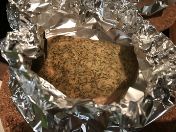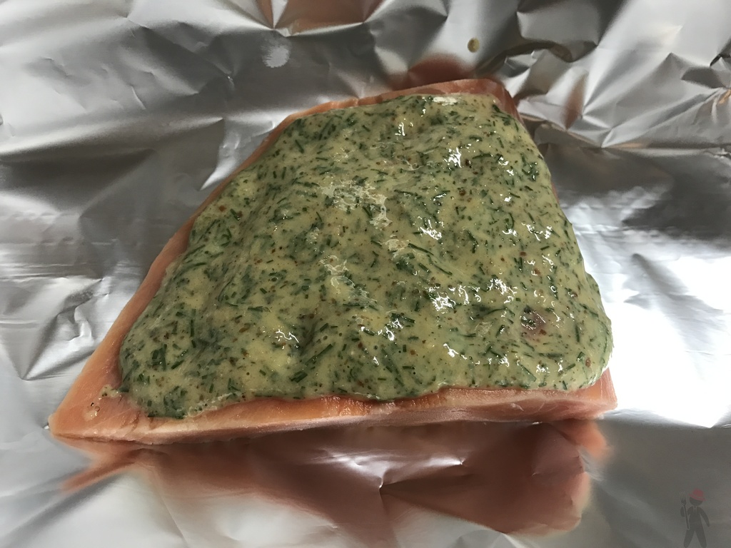 Dann je ein Lachsfilet auf ein großzügiges Stück Alufolie legen und die Oberseite mit der Hälfte der Senfmasse bestreichen. Dann die Ränder der Alufolie so nach oben falten, dass der Lachs relativ eng eingepackt ist, aber oben offen. Den Lachs dann im vorgeheizten Backofen bei 180° für 15 Minuten backen.