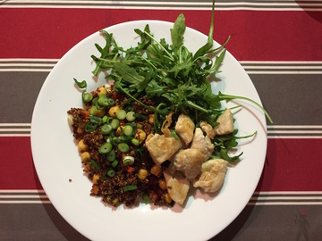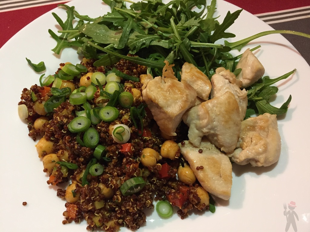 In einem kleinen Topf einen Löffel Olivenöl erhitzen, das Quinoa dazugeben und darin kurz anrösten. Dann mit der Gemüsebrühe aufgießen, aufkochen lassen und dann die Hitze reduzieren. Auf sehr niedriger Stufe für 20min köcheln lassen, dabei gelegentlich prüfen ob noch genug Flüssigkeit vorhanden ist und ggf noch etwas Wasser zugeben.