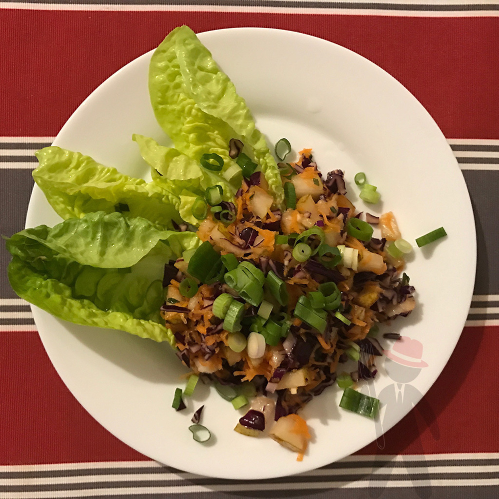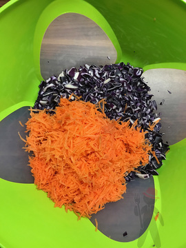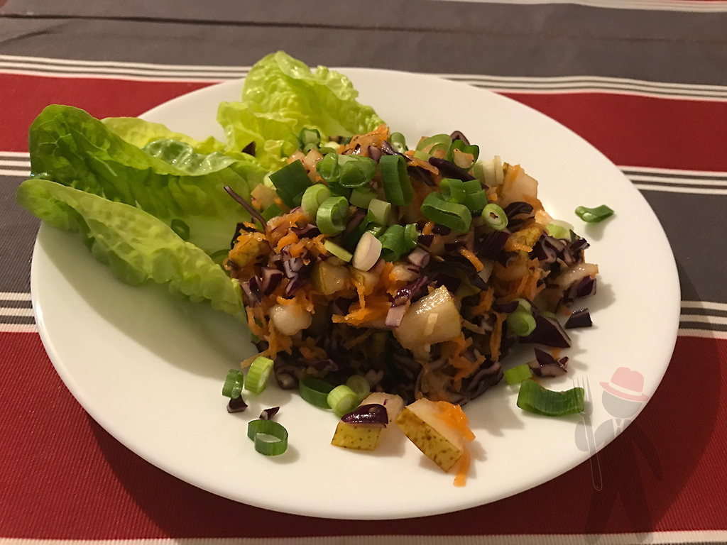 Rotkohl, Birnen und Möhren mit dem Dressing vermischen. Dieser Salat kann nun entweder sofort serviert werden oder noch etwas durchziehen. So kann der Salat auch noch bis zum nächsten Tag im Kühlschrank aufbewahrt werden.