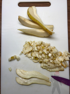 Für das Dressing den Knoblauch sowie die Petersilie fein hacken. Dann beides mit dem Essig, dem Öl, dem Senf sowie dem Birnensaft vermischen. Nach Geschmack mit Salz und Pfeffer würzen und alles gut vermischen.