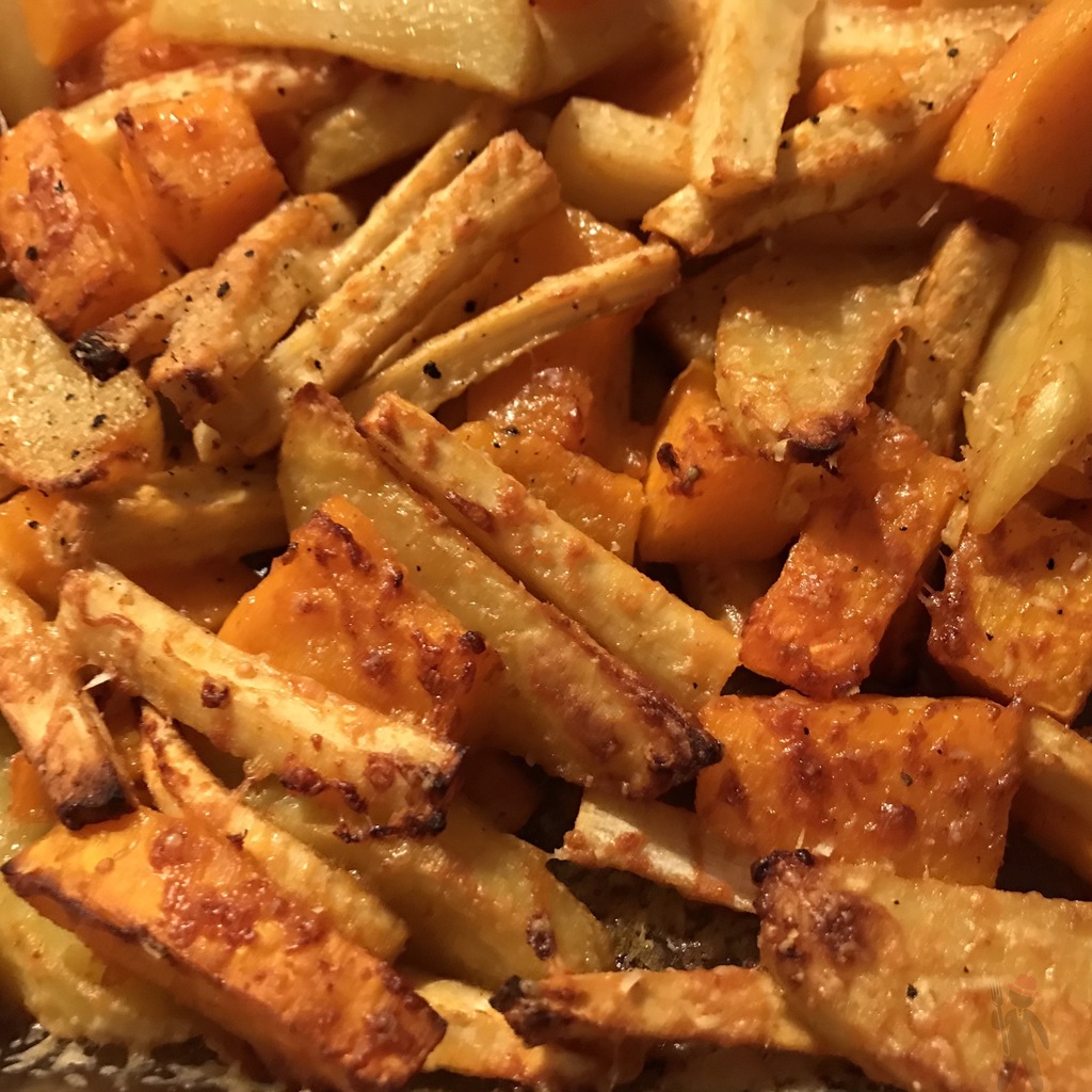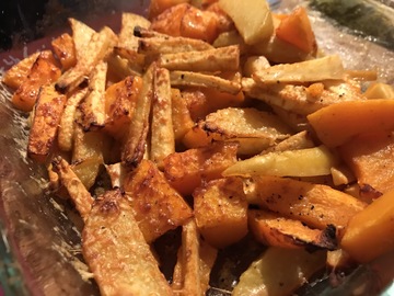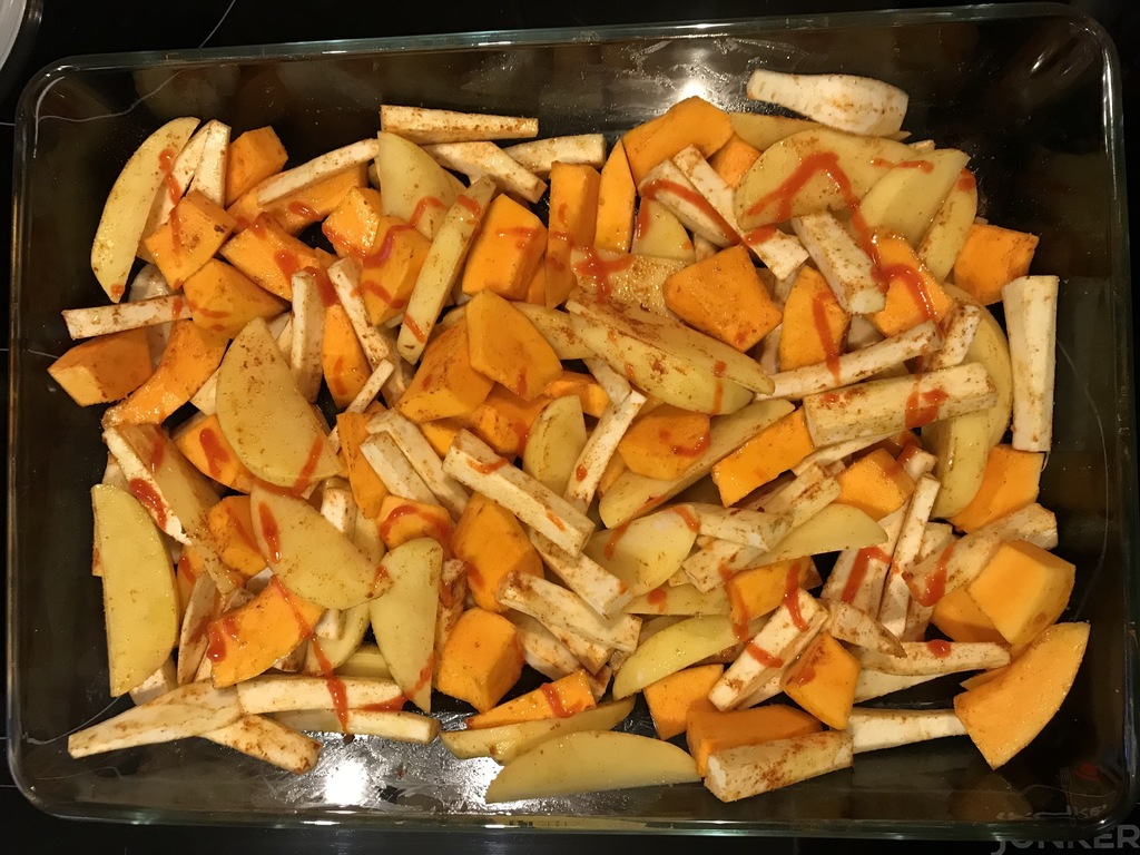 Gemüse waschen und dann die Pastinaken (und je nach Geschmack auch den Kürbis) schälen. Pastinaken in dünne Stifte schneiden, die Kartoffeln in Spalten und den Kürbis in Stücke. Den Backofen auf 200° (180° Umluft) vorheizen. Das Gemüse in eine große Auflaufform geben und mit den Gewürzen, dem Öl und der Sauce gut vermischen.