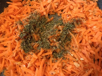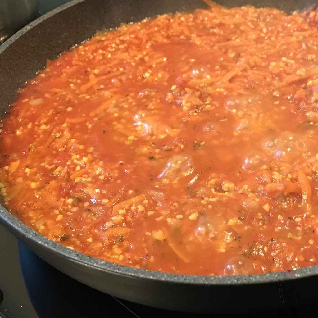 In einer tiefen Pfanne das Olivenöl erhitzen und dann zunächst die Zwiebelwürfel glasig anschwitzen. Wenn die Zwiebeln anfangen braun zu werden zunächst den Knoblauch dazugeben. Nach etwa 1-2 Minuten auch die geraspelten Möhren dazugeben und alles weiter andünsten. Das Gemüse mit Oregano und Paprikapulver würzen. Zuletzt den Lupinenschrot dazugeben und auch kurz mitbraten.